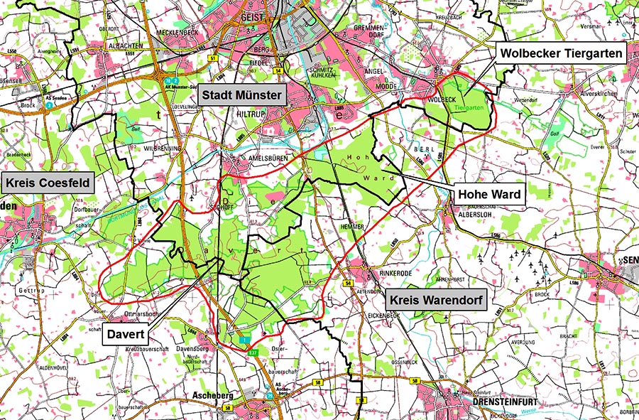 ![]() Auf dieser Karte sind 3 Waldgebiete im Südosten von Münster zu