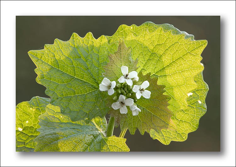 Die Knoblauchsrauke (= Knoblauchhederich) ist ab April eine sehr häufige Blume am Wegrand. Die fein geäderten Blätter bilden eine schöne Umrandung für den Blütenstand, besonders wenn die Sonne die Blätter ausnahmsweise von der Rückseite beleuchtet. |