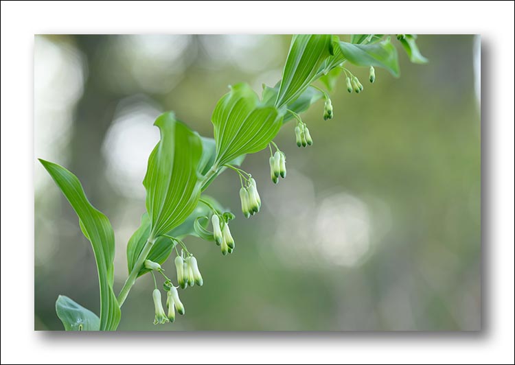 Vielblütige Weißwurz (= vielblütiges Salomonssiegel) ist ein zartes aber auffallendes Liliengewächs auf dem Waldboden. Der lange Stängel ist leicht gebogen und trägt von unten bis oben wechselständige, parallelnervige Blätter. Aus jeder Blattachsel hängt eine Gruppe weißlicher Blüten. |