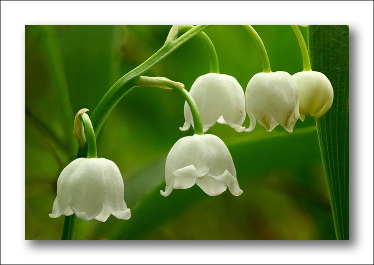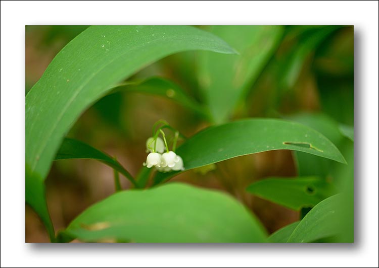 Erst Mitte Mai fand ich eine kleine Gruppe von Maiglöchcken. Die Blüten hängen etwas versteckt zwischen den großen Blättern. |