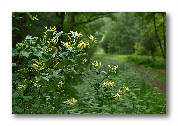 Das Wald-Geissblatt ist eine Kletterpflanze, die sich an den Büschen am Wegrand emporwindet. |