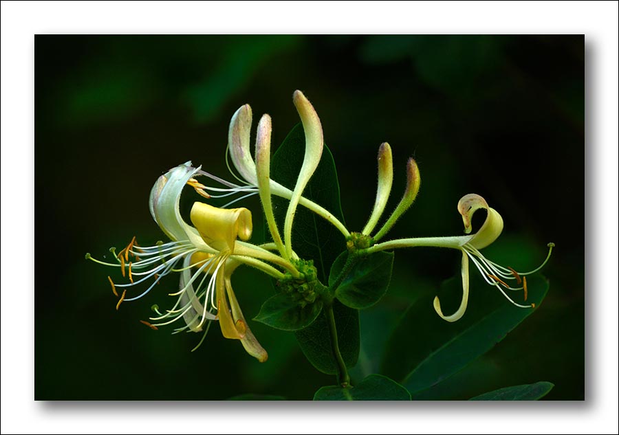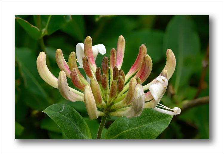 Den Blütenstand des Geissblattes finde ich prächtig, besonders wenn einzelne Blüten weit aufgeblüht sind. (↓) |
