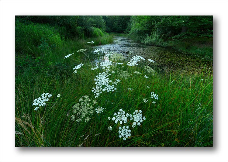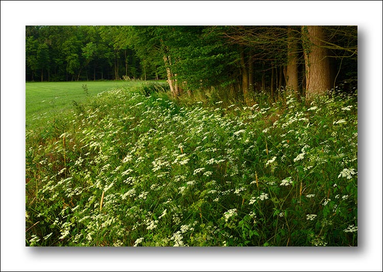 Im Sommer sind für ein paar Wochen die Doldenblütler die auffälligsten Blumen. Der Taumel-Kälberkopf wächst hier in einem dichten Bestand am Waldrand. |