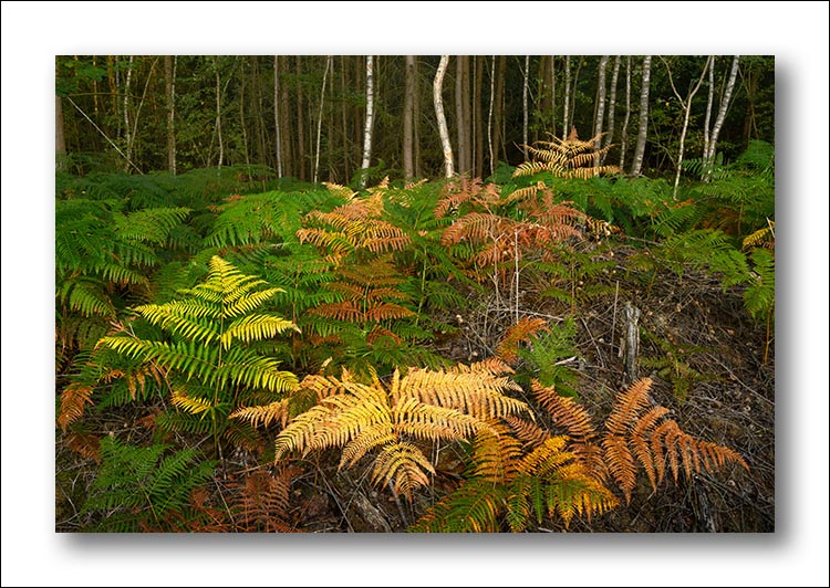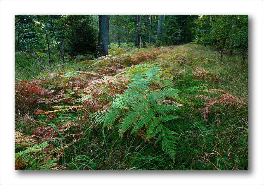 Mitte September sind die Farne die ersten Pflanzen des Waldes, die gelbe bis rotbraune Herbstfarben tragen. |
