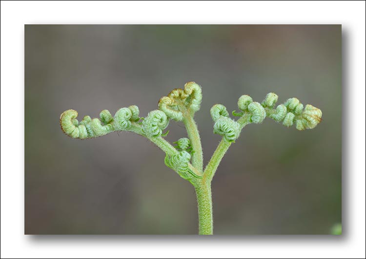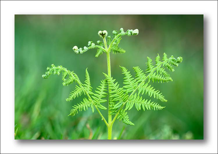 Der Adlerfarn lässt sich Zeit mit dem Keimen. Erst Mitte April kommen die ersten Pflänzchen aus dem Waldboden. Auffallend ist das Wachstum durch Ausrollen von Ästen und Blättchen, ganz anders als das Wachsen der Keimlinge bei Blütenpflanzen. |