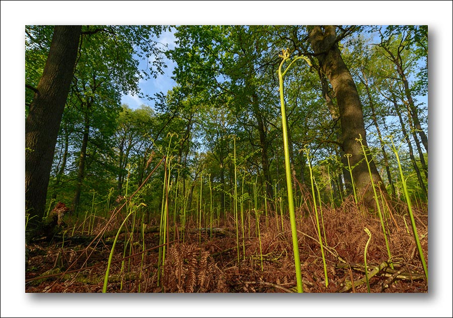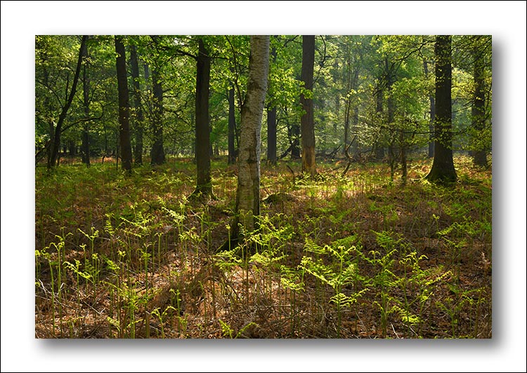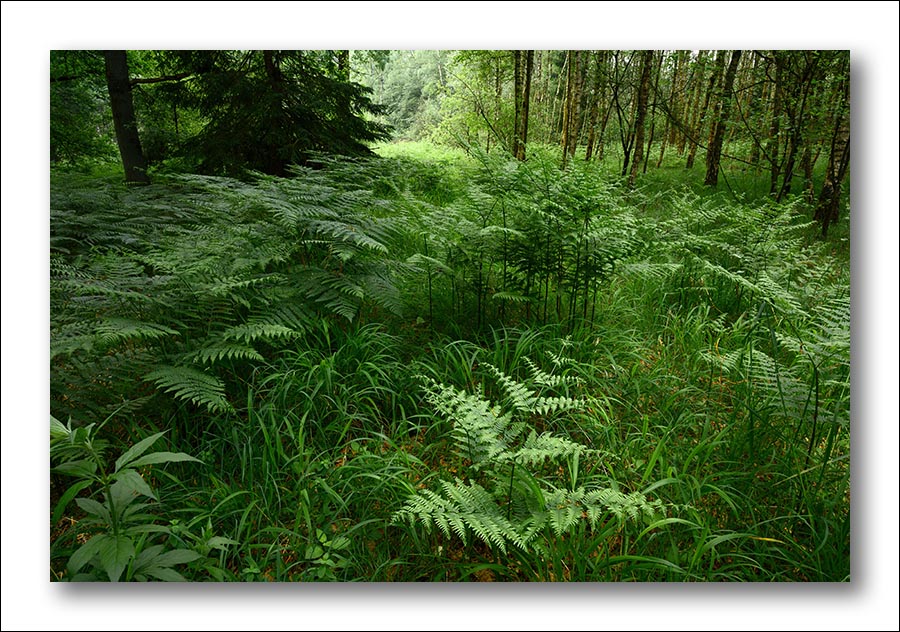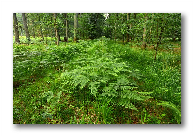 Anfang Juni sind die jungen Farne voll ausgebildet. Hier haben sie einen Waldeg besetzt, sodass man kaum noch hindurchgehen kann. |