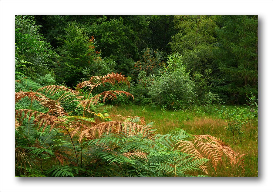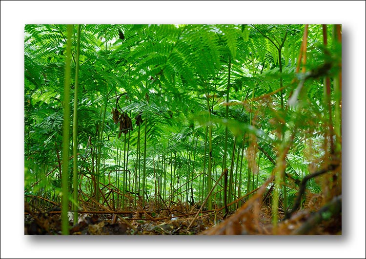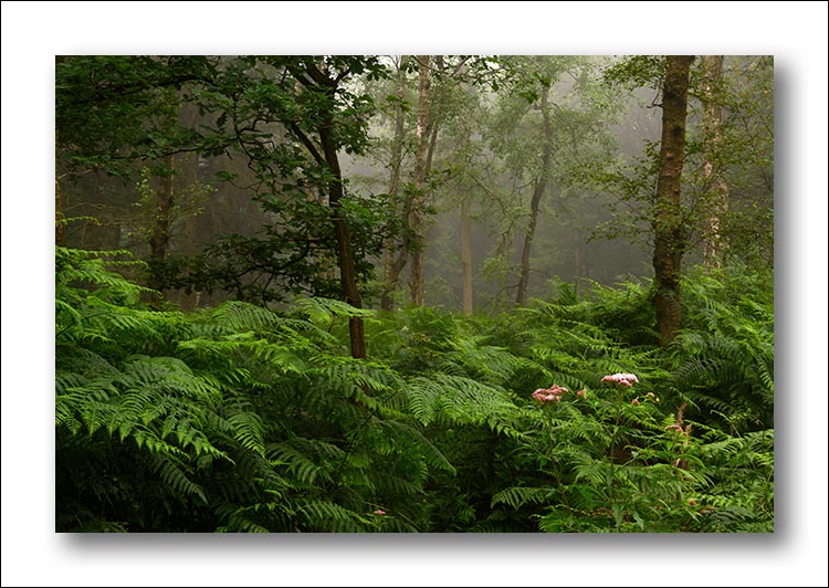 An einem nebligen Morgen Mitte Juli sieht es ein bisschen nach Tropenwald aus. Die ausgewachsenen Farne bilden ein undurchdringliches Pflanzendickicht. Der Frühnebel zwischen den Bäumen vermittelt eine gespenstische Atmosphäre. |