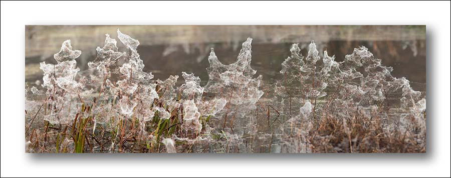 ![]() Gefrorene Wassertröpfchen machten die zarten Formen der Spinnennetze sichtbar. |