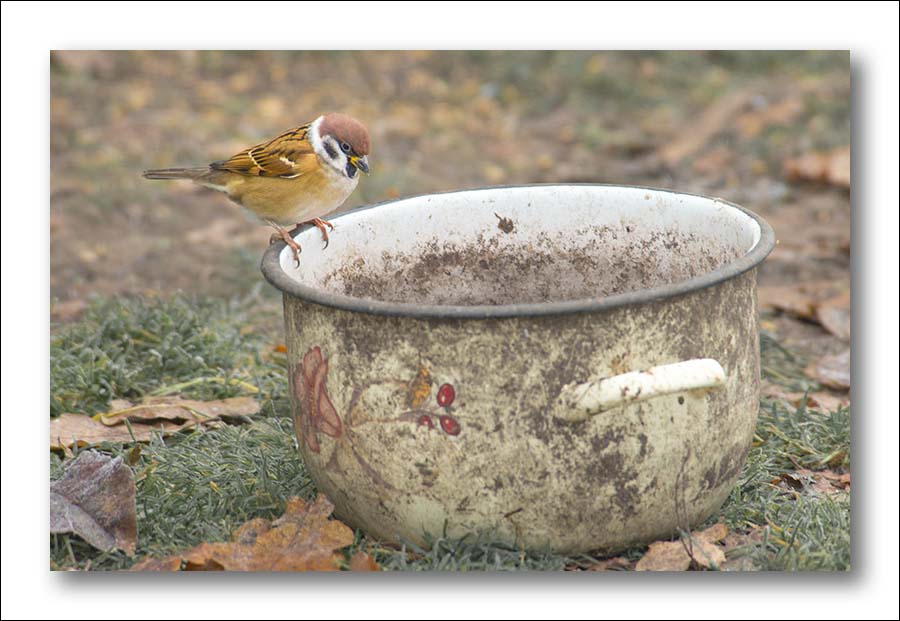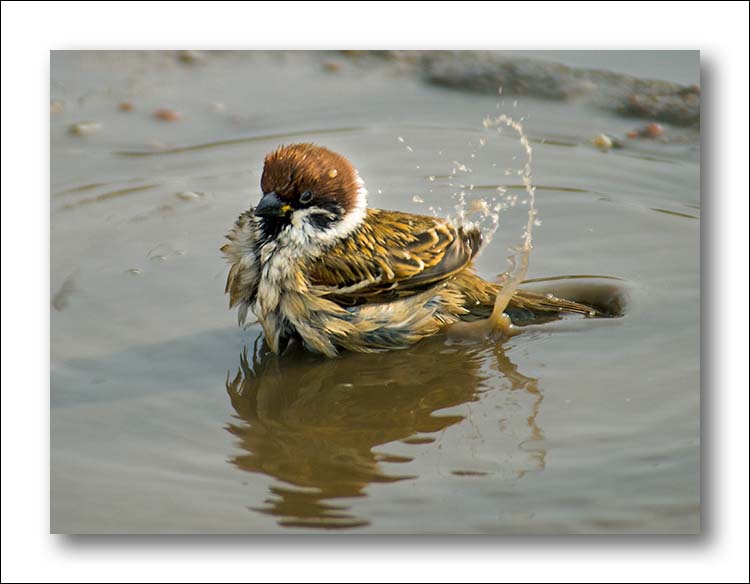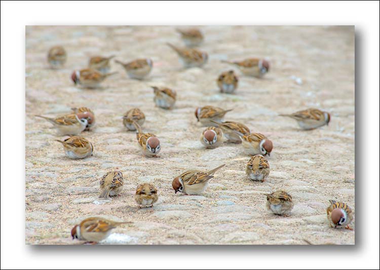 Die Kopfsteinpflaster-Straße und die benachbarten Höfe sind der Lebensraum von Feldsperlingsschwärmen. Sie baden eifrig in den Pfützen. |