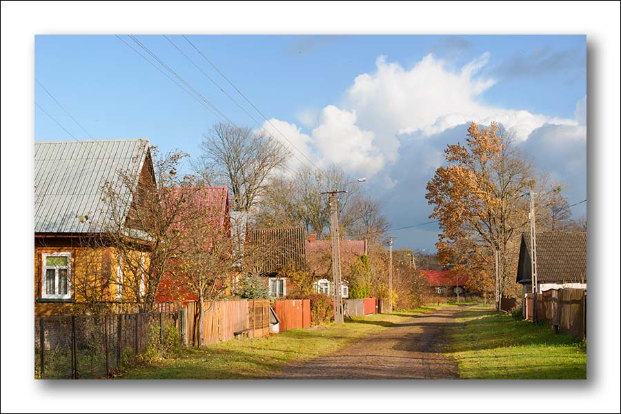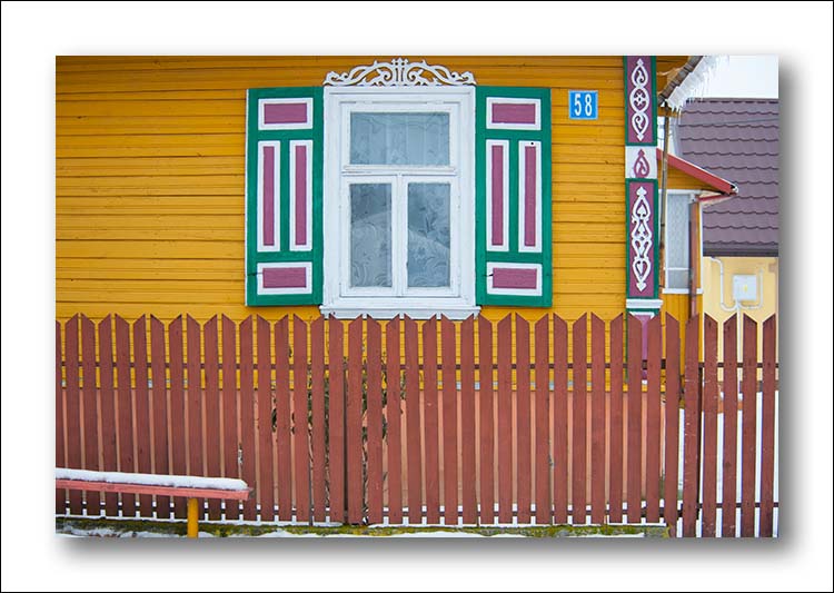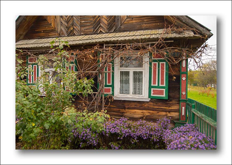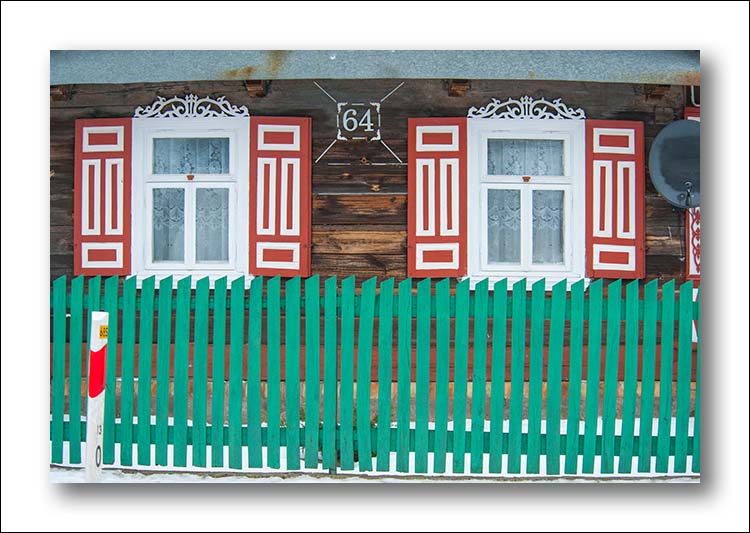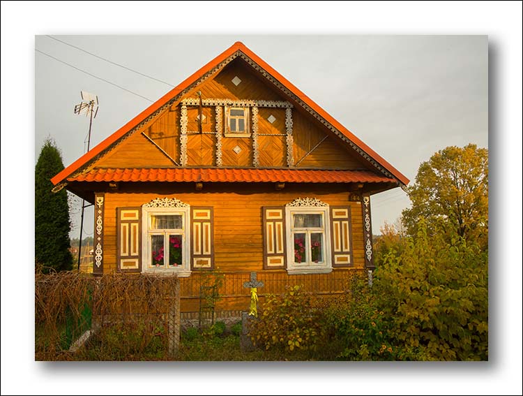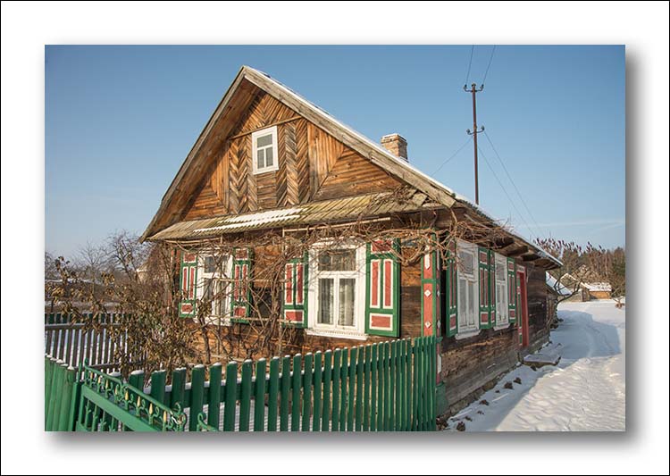Einige Dörfer an der oberen Narew haben ein besonderes Dorfbild. Es gibt besonders viele Holzhäuser, die mit Ornamenten und bunten Fensterläden verziert sind. |