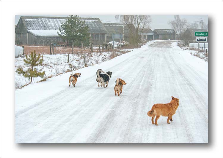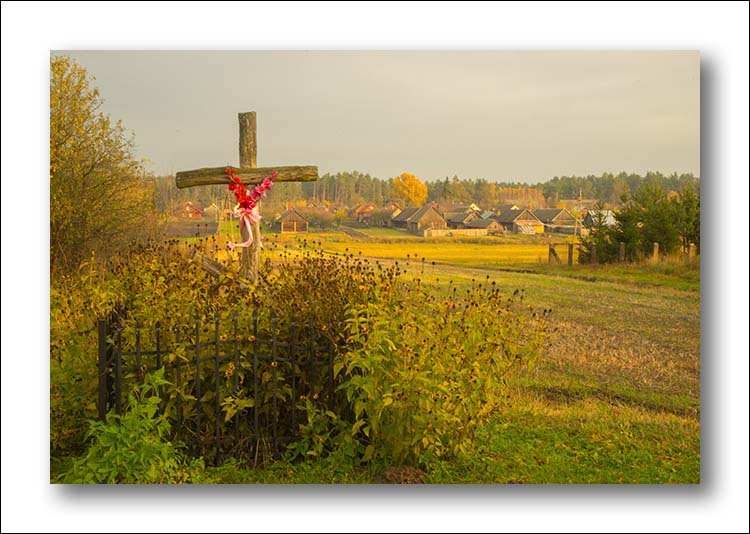 Wenn ich in ein Dorf hineinfuhr, dann wurde ich oft von so einem Empfangskomitee mehr oder weniger freundlich begrüßt. Fuhr ich wieder hinaus, dann war das Komitee auch wieder zur Stelle. Dieses Empfangskomitee hier gibt sich nun die Ehre, den Gästen dieser Webseite für ihren Besuch zu danken. Es gibt noch viele schöne Plätze und Dörfer an der oberen Narew, die hier unerwähnt geblieben sind. Das letzte Bild dieser Serie zeigt das Dorf Koźliki am Südufer der Narew, ein Anblick wie aus einem alten Gemälde.. ( ↓ ) |