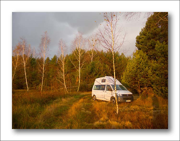 Es war nicht schwer, einen ruhigen Übernachtungsplatz zu finden. Mein Lieblingsplatz liegt geschützt an einem Waldrand mit weitem Blick über das Narew-Tal. |