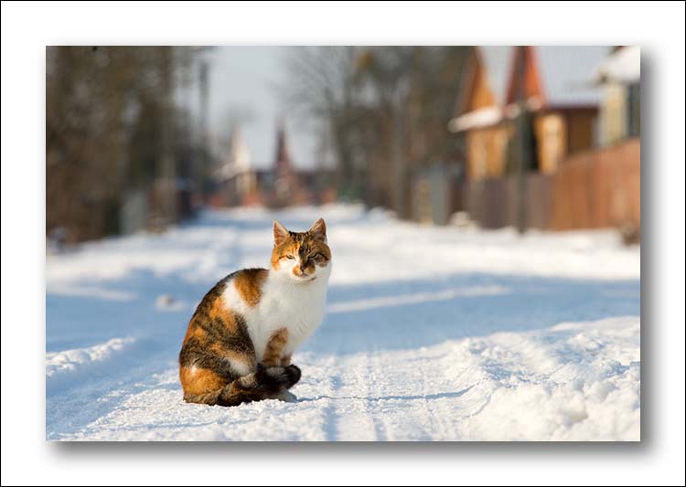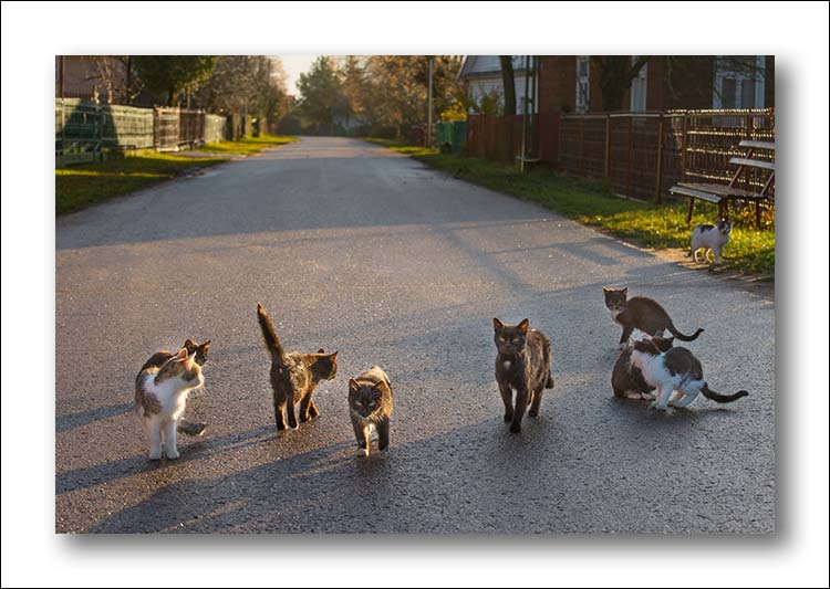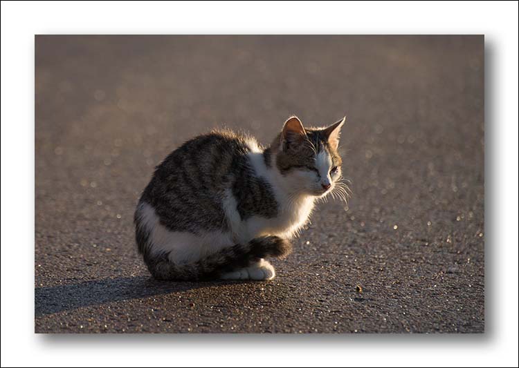 In diesem Dorf ist die Hauptstraße frisch asphaltiert. Die Morgensonne hat den dunklen Belag schnell aufgewärmt und die Straße so zu einem Spielplatz für die Kätzchen des Dorfes gemacht. |