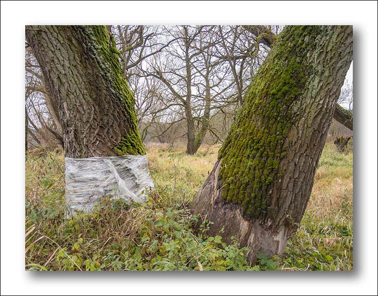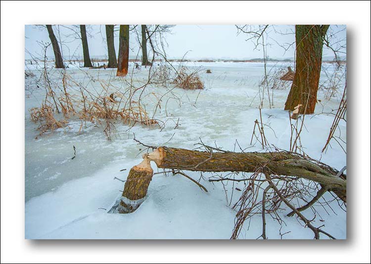 Auch im Winter findet man zahlreiche frische Nagespuren. Aber bald musste ich feststellen, dass die Bieber gewaltige Schäden and Wald, Ufer und Schutzdämmen anrichten. |