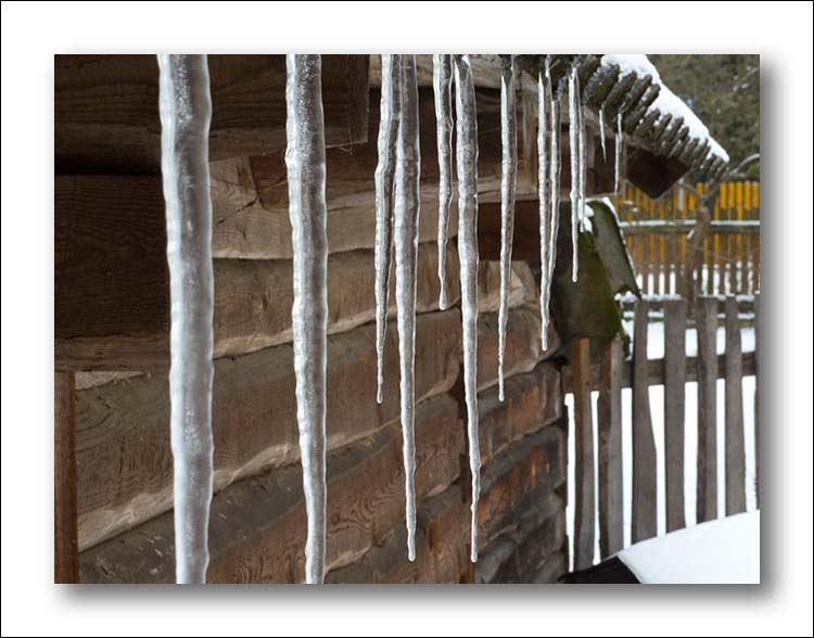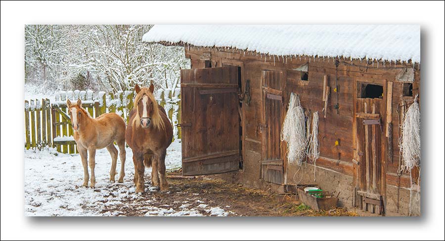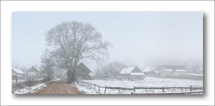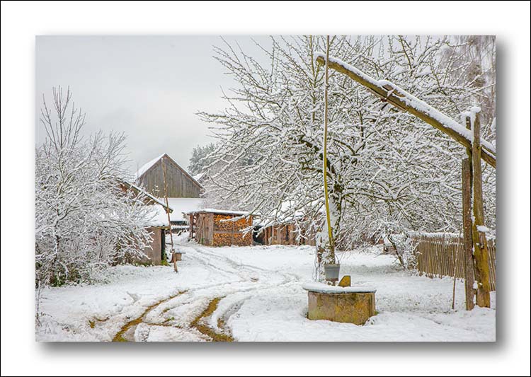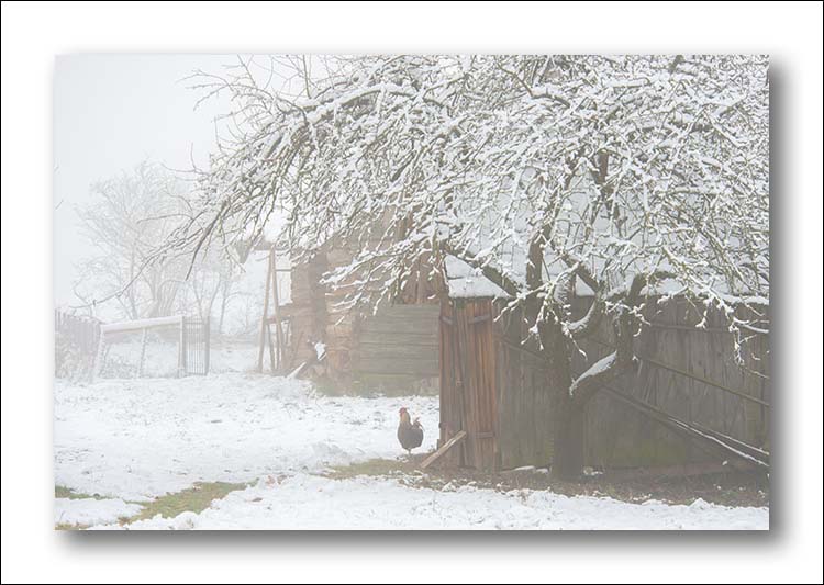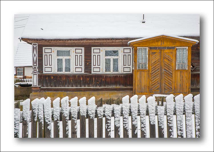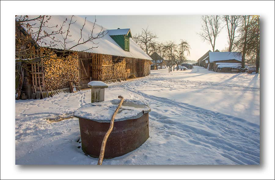 Von dort führt das kleine Sträßchen weiter nach Ciełuszki. Dies Dorf liegt an der Kante zum Tal und nahe zum Fluß. Für dieses Bild hat der Winter persönlich den alten Holzstall dekoriert. |
