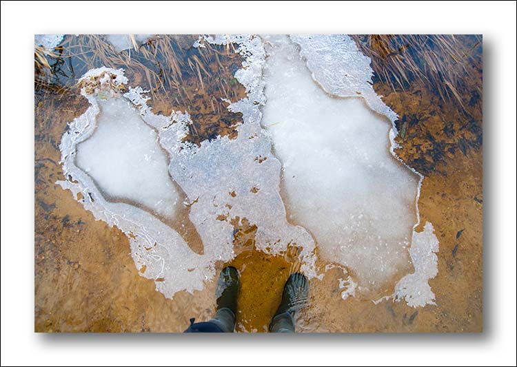 Vom Talrand einen Weg zum Fluß zu suchen ist immer ein kleines Abenteuer Die Wege sind überschwemmt und an manchen Stellen hat schnell fließendes Wasser das tragende Eis weggeschmolzen. |