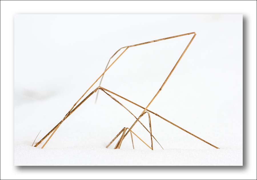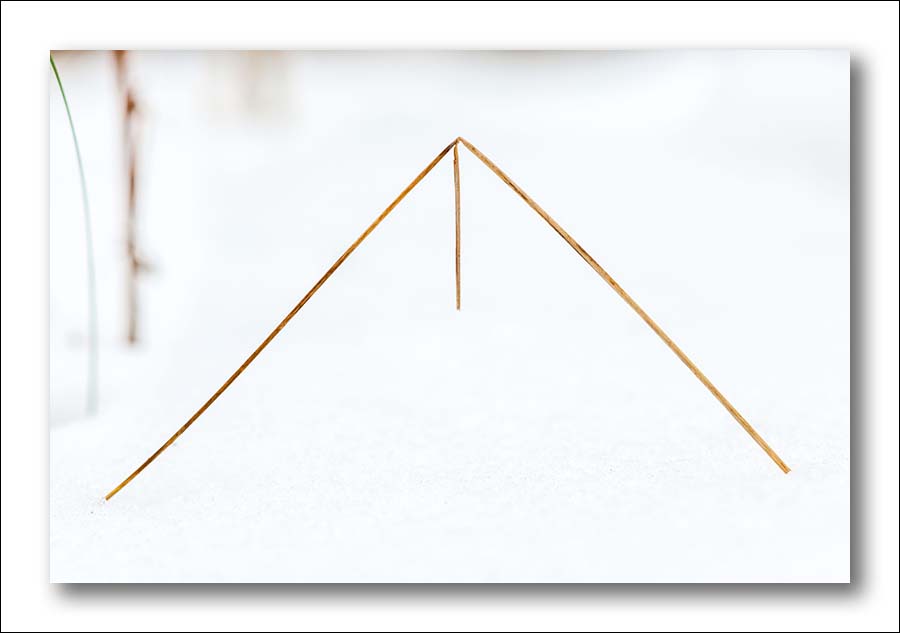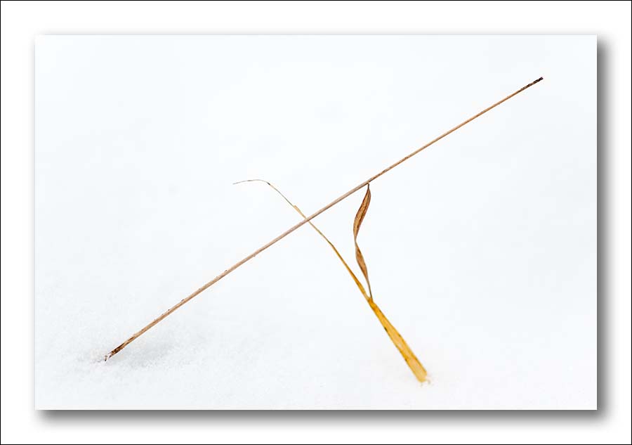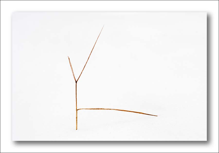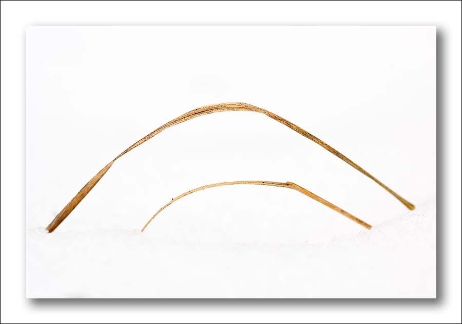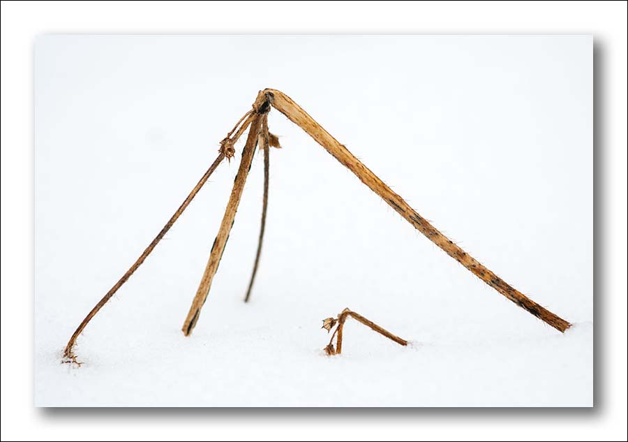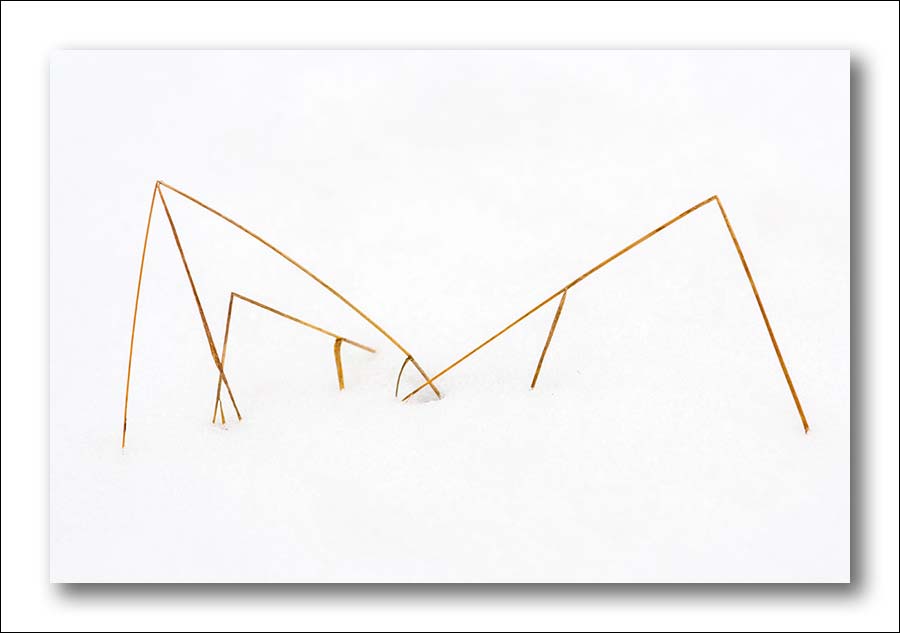 Winterwetter ließ die Grashalme zusammenbrechen. Aber einige spitzten noch ein weing aus dem Schnee hervor. Von Weitem sah das nach nichts aus. Aber das Weiß des Schnees war der perfekte Hintergrund für die winzigen Skulpturen aus zerknitterten Halmen. Die nächsten sieben Aufnahmen entstanden in dem natürlichen Skulpturengarten an diesem Waldweg. ( ↓ ) |